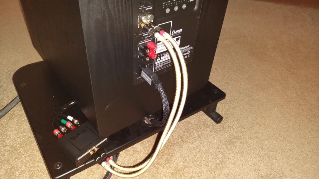- Connect to Subwoofer: Next, connect another set of speaker cables from the adapter to the subwoofer’s input terminals.